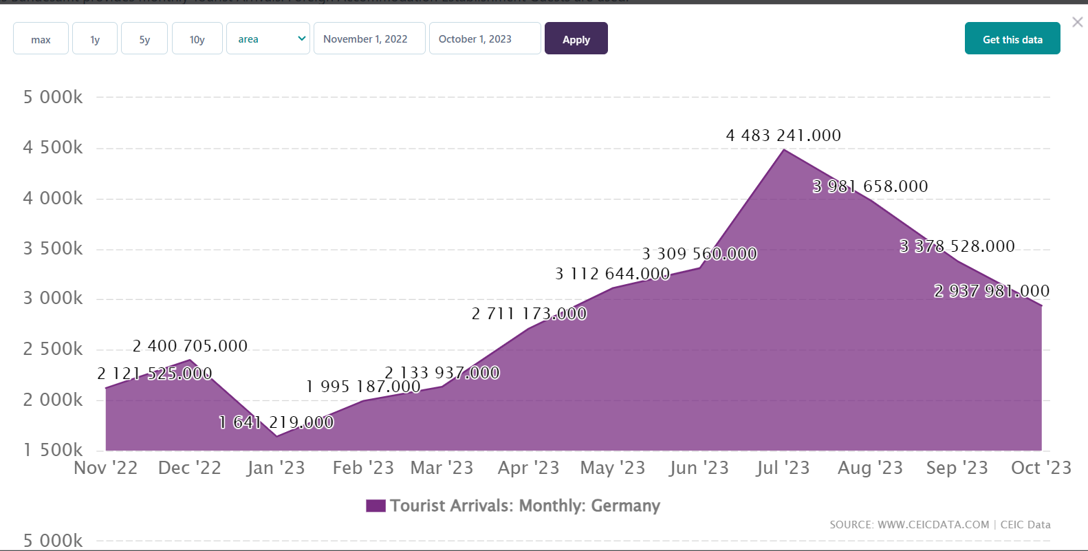 - Over the entire year, the total number of tourists who visited Germany in 2023 was approximately 67 million. This includes both domestic and international guests and is based on the number of overnight stays recorded by accommodation establishments