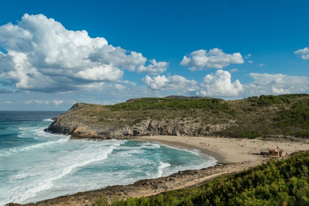 Located at the northern tip of Mallorca, the Playa de Formentor is a narrow beach framed by pine-covered mountains and clear Mediterranean waters. The beach offers a peaceful escape with stunning scenery, and it’s accessible by car or boat from Port de Pollença.